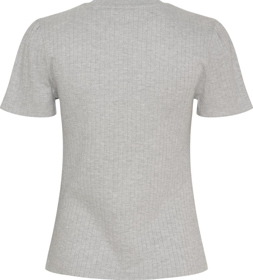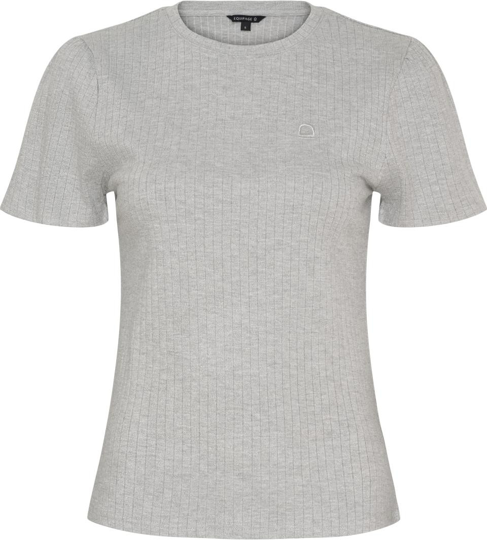 Verfijnd geribbeld T-shirt met glitter over de hele stof en logo-borduurwerk op de borst. Ronde halslijn, korte mouwen met een licht plooieffect aan de bovenkant. De stof voelt erg zacht aan.