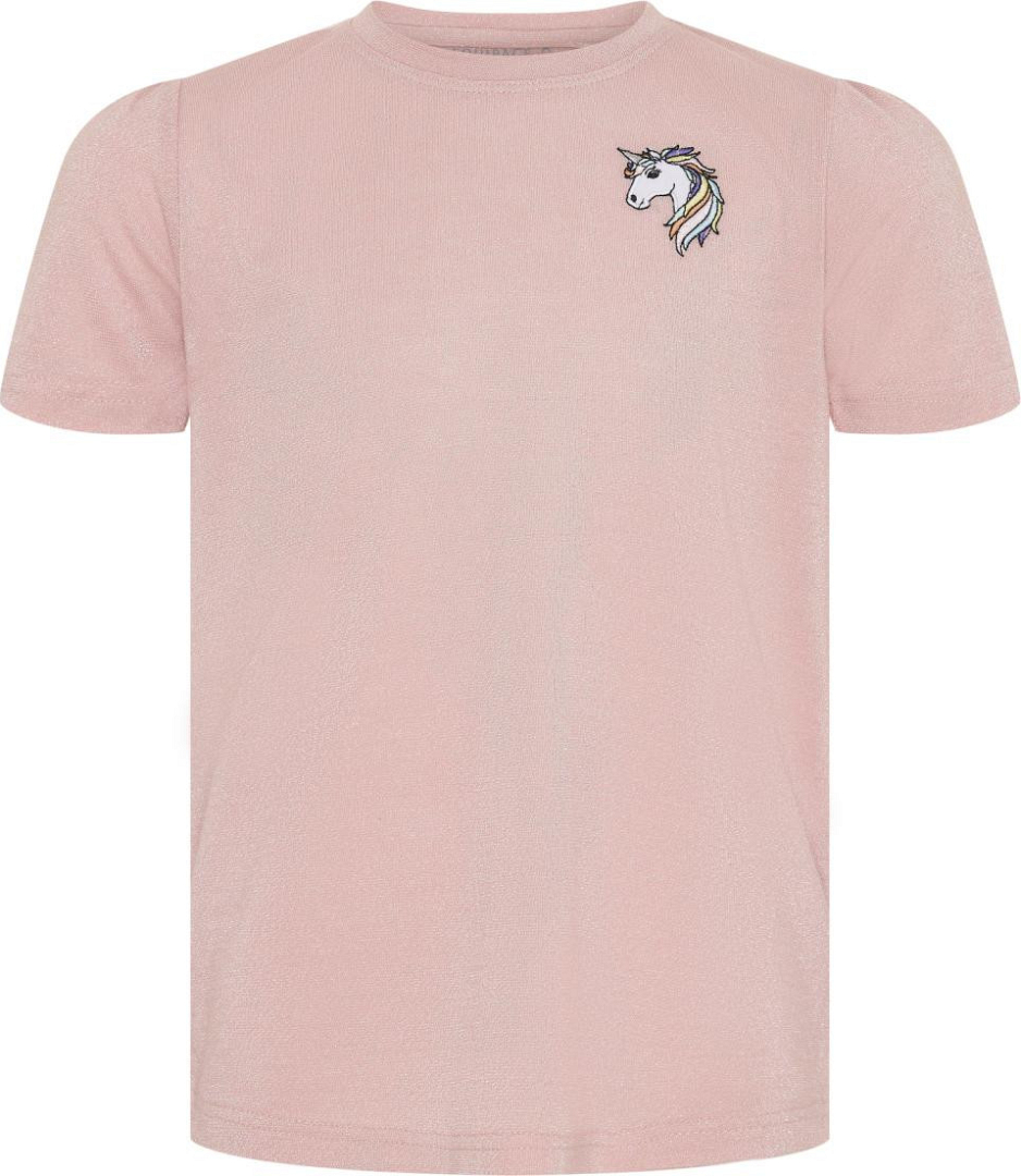 Kinder-T-shirt met korte mouwen en ronde hals en delicate pofmouwen. Regular fit voor maximaal comfort. Superzacht en lichtgewicht katoenen jersey. Gemaakt van zilverkleurige lurexstof voor een glittereffect. Grote, veelkleurige eenhoornprint op de borst.